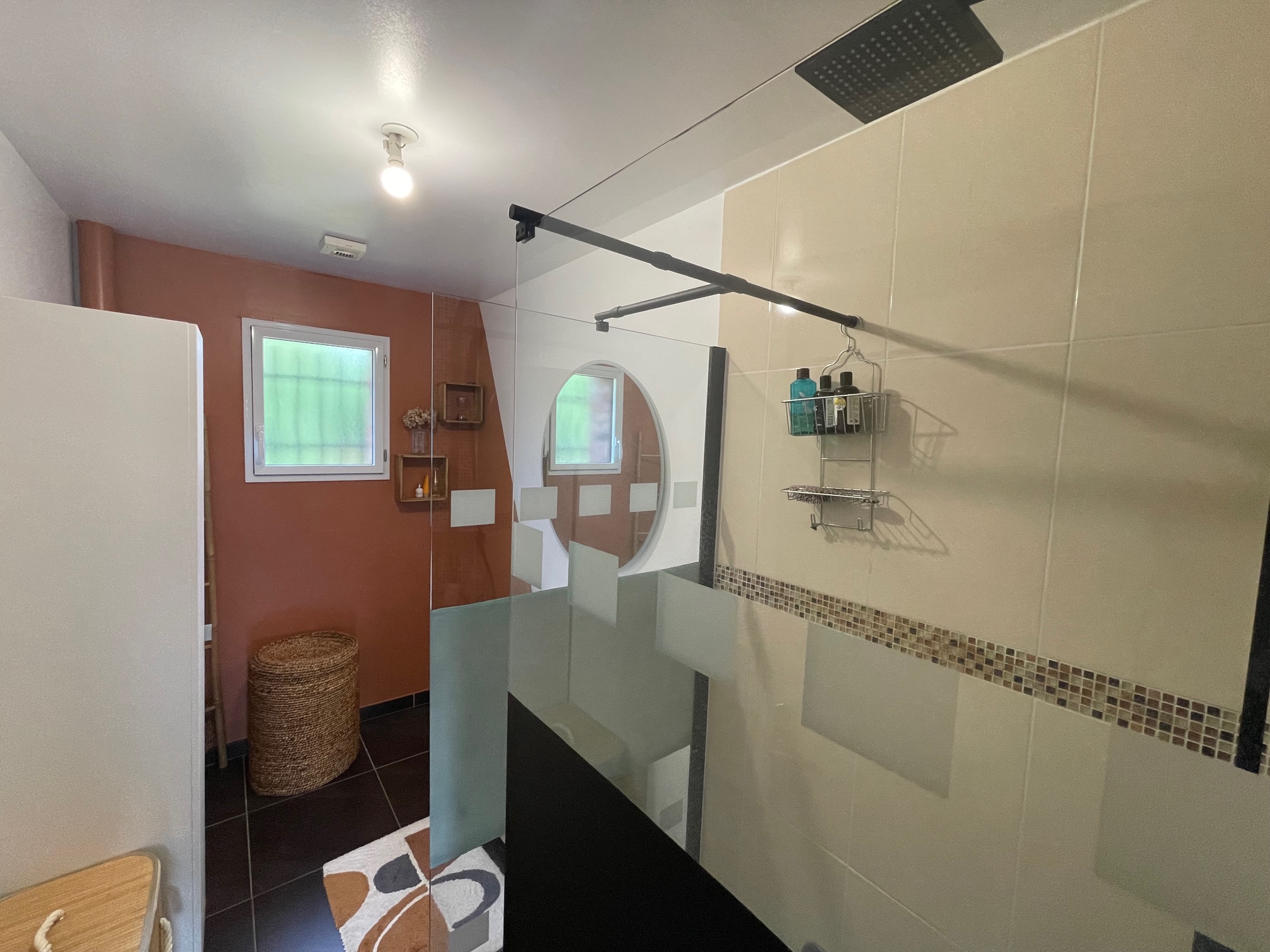 Elle vous offre au rez de chaussée : Un hall d’entrée, salon séjour ouvert sur cuisine aménagée équipée, une chambre, salle de bains, garage, buanderie, terrasse, jardin bien exposé. A l’étage : un palier, 3 chambres, salle de bains avec WC. C/C Electrique + poêle à bois.